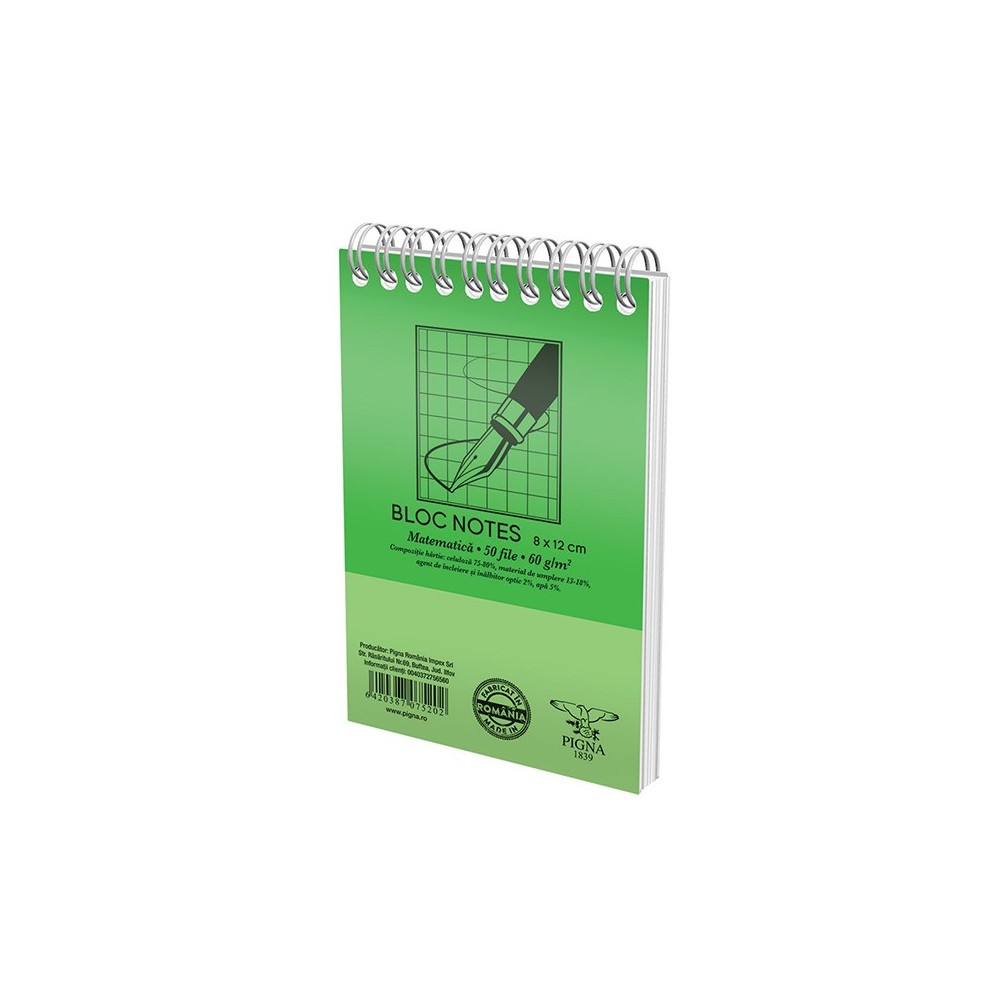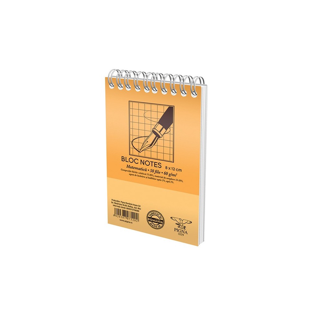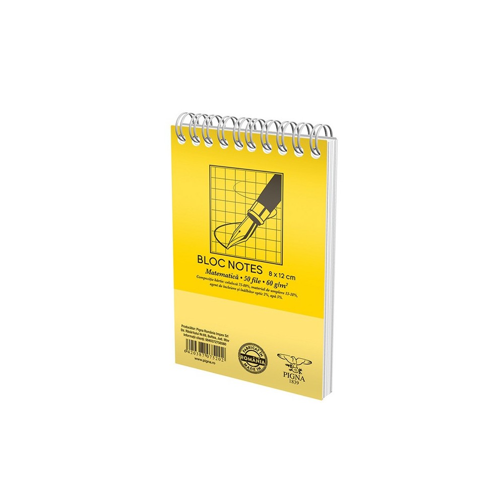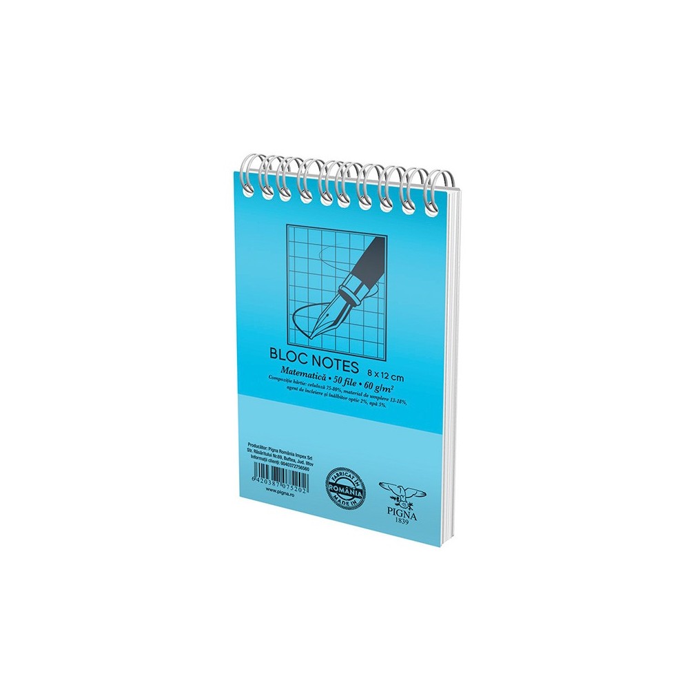 Bloc notes-ul Pigna Basic in format A7 este un instrument practic pentru notite rapide si calcule matematice. Cu dimensiuni de 80 x 120 mm, acest bloc notes este usor de transportat si utilizat in diverse situatii. Numar de file: 50. Liniatura: matematica. Tipul hartiei: Hartie offset de 60 g/mp. Spira metalica dubla pe latura mica, permitand intoarcerea copertilor la 360 de grade. Coperta fata carton flexibil monocrom, iar coperta spate carton rigid. Acest bloc notes este ideal pentru studenti, profesionisti sau oricine are nevoie de un suport compact pentru notite matematice. Designul sau functional si materialele de calitate asigura o utilizare confortabila si durabila.