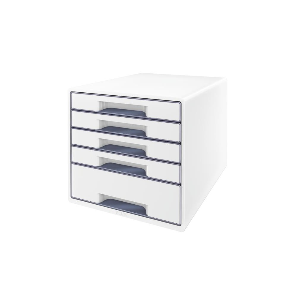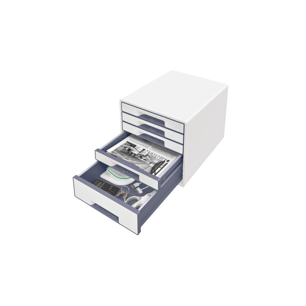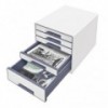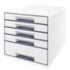 Suport cu sertare WOW, atragator, calitate premium, finisaj lucios. Se asorteaza perfect cu alte produse din gama Leitz WOW. Se livreaza cu un marker alb, suport de eticheta transparent si inscriptibil, pentru identificarea usoara a continutului, si tavita pentru accesorii, transparenta, pentru depozitarea in siguranta a diverselor articole de birou, precum pixuri, agrafe, etichete etc. Sistem unic de inchidere a sertarelor, o singura apasare si sertarul ramane ferm inchis. Sertare cu glisare usoara, dotate cu sistem de oprire pentru a preveni caderea. Sertare inchise pentru a proteja confidentialitatea documentelor, cu un design modern si decupaj frontal pentru a facilita deschiderea. 4 sertare mici pentru depozitarea documentelor de birou si a produselor pentru arhivare, precum plicuri, folii de protectie, mape, dosare, mape cu elastic, si 1 sertar mare pentru a stoca orice tip de accesorii de birou de dimensiuni potrivite, precum capsator, perforator, incarcator telefon mobil, etc. Baza cu sistem anti-alunecare, datorita elementelor din cauciuc. Se pot suprapune in coloana pana la 3 suporturi.