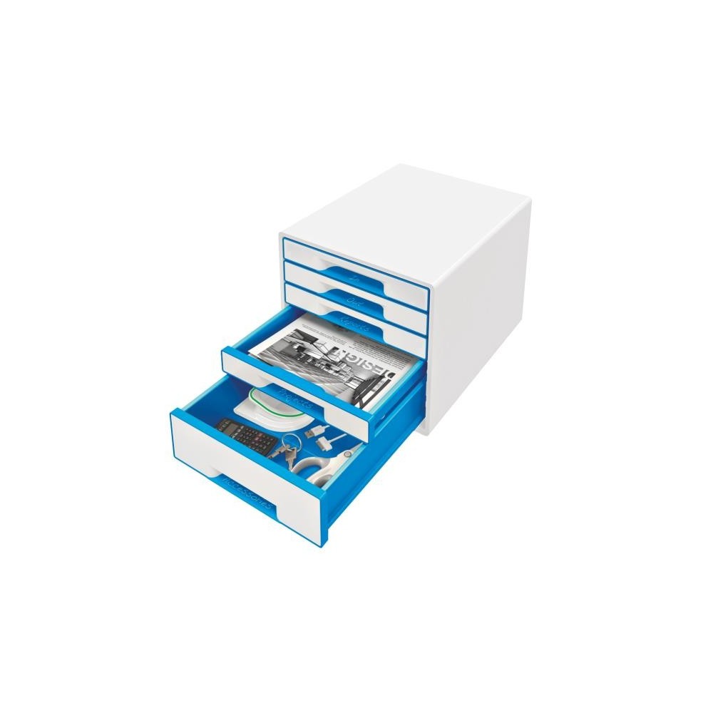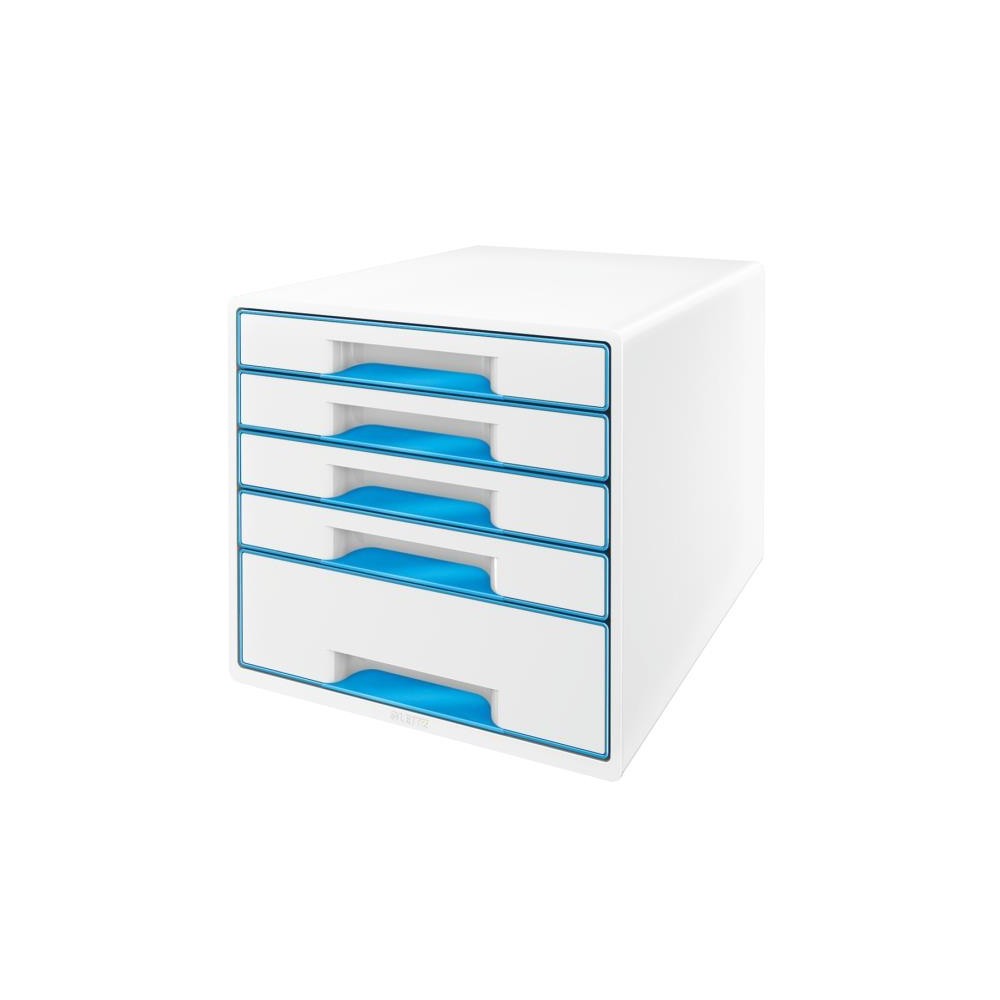 Suport cu sertare WOW, atragator, calitate premium, finisaj lucios. Se asorteaza perfect cu alte produse din gama Leitz WOW. Se livreaza cu un marker alb, suport de eticheta transparent si inscriptibil, pentru identificarea usoara a continutului, si tavita pentru accesorii, transparenta, pentru depozitarea in siguranta a diverselor articole de birou, precum pixuri, agrafe, etichete etc. Sistem unic de inchidere a sertarelor, o singura apasare si sertarul ramane ferm inchis. Sertare cu glisare usoara, dotate cu sistem de oprire pentru a preveni caderea. Sertare inchise pentru a proteja confidentialitatea documentelor, cu un design modern si decupaj frontal pentru a facilita deschiderea. 4 sertare mici pentru depozitarea documentelor de birou si a produselor pentru arhivare, precum plicuri, folii de protectie, mape, dosare, mape cu elastic, si 1 sertar mare pentru a stoca orice tip de accesorii de birou de dimensiuni potrivite, precum capsator, perforator, incarcator telefon mobil, etc. Baza cu sistem anti-alunecare, datorita elementelor din cauciuc. Se pot suprapune in coloana pana la 3 suporturi.