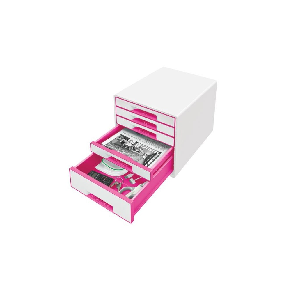 Suport cu sertare WOW, atragator, calitate premium, finisaj lucios. Se asorteaza perfect cu alte produse din gama Leitz WOW. Se livreaza cu un marker alb, suport de eticheta transparent si inscriptibil, pentru identificarea usoara a continutului, si tavita pentru accesorii, transparenta, pentru depozitarea in siguranta a diverselor articole de birou, precum pixuri, agrafe, etichete etc. Sistem unic de inchidere a sertarelor, o singura apasare si sertarul ramane ferm inchis. Sertare cu glisare usoara, dotate cu sistem de oprire pentru a preveni caderea. Sertare inchise pentru a proteja confidentialitatea documentelor, cu un design modern si decupaj frontal pentru a facilita deschiderea. 4 sertare mici pentru depozitarea documentelor de birou si a produselor pentru arhivare, precum plicuri, folii de protectie, mape, dosare, mape cu elastic, si 1 sertar mare pentru a stoca orice tip de accesorii de birou de dimensiuni potrivite, precum capsator, perforator, incarcator telefon mobil, etc. Baza cu sistem anti-alunecare, datorita elementelor din cauciuc. Se pot suprapune in coloana pana la 3 suporturi.