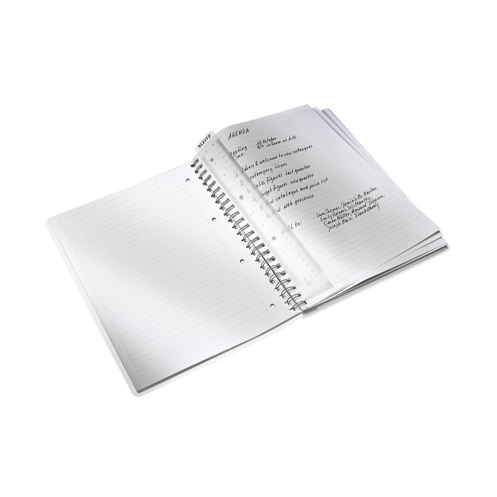 Caiet de birou cu coperta din Poilipropilena (PP) de inalta calitate, in design modern Wow, cu efect dual color. Cu buzunar suplimentar pentru diverse documente si accesorii. Dotat cu rigla gradata ce poate fi folosita si ca semn de pagina. Incape in mapa Jumbo Leitz Wow, Mapa tip Proiect Leitz Wow si in suportul vertical sau tavitele pentru birou. Legare rezistenta cu spira, pentru a facilita rasfoirea si pentru o folosire de durata. Coli microperforate care se rup usor.