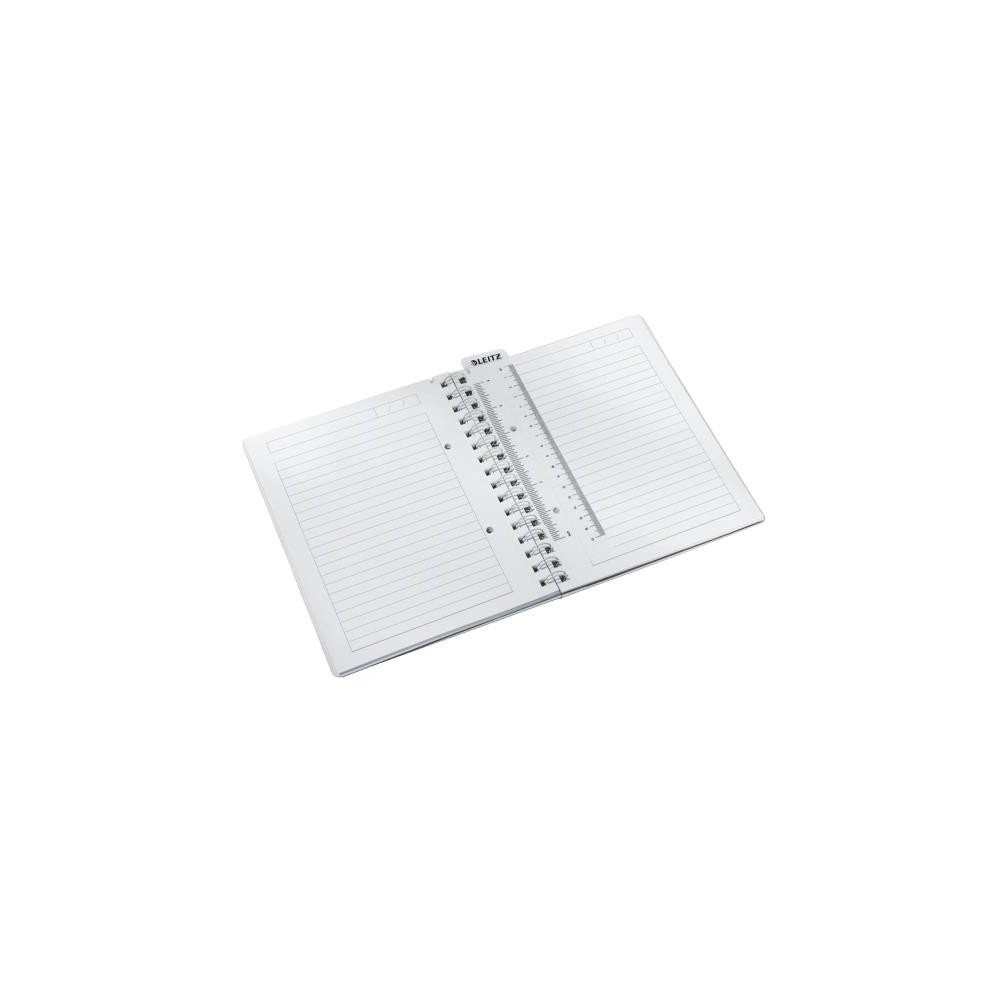 Caiet de birou cu coperta din Poilipropilena (PP) de inalta calitate, in design modern Wow, cu efect dual color. Cu buzunar suplimentar pentru diverse documente si accesorii. Dotat cu rigla gradata ce poate fi folosita si ca semn de pagina. Incape in mapa Jumbo Leitz Wow, Mapa tip Proiect Leitz Wow si in suportul vertical sau tavitele pentru birou. Legare rezistenta cu spira, pentru a facilita rasfoirea si pentru o folosire de durata. Coli microperforate care se rup usor.
