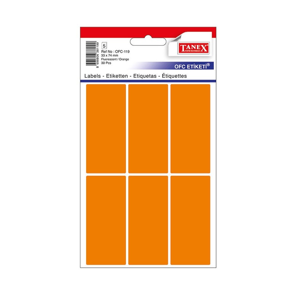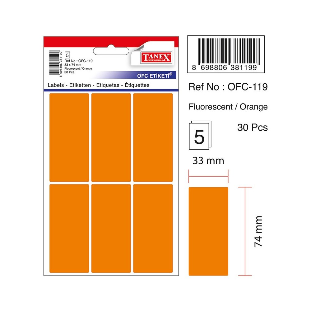 Dimensiuni eticheta: 33 x 74 mm. Forma dreptungiulara, colturi rotunjite. Culoare: portocaliu. Ambalare: 30 etichete/set (5 folii x 6 etichete/folie).