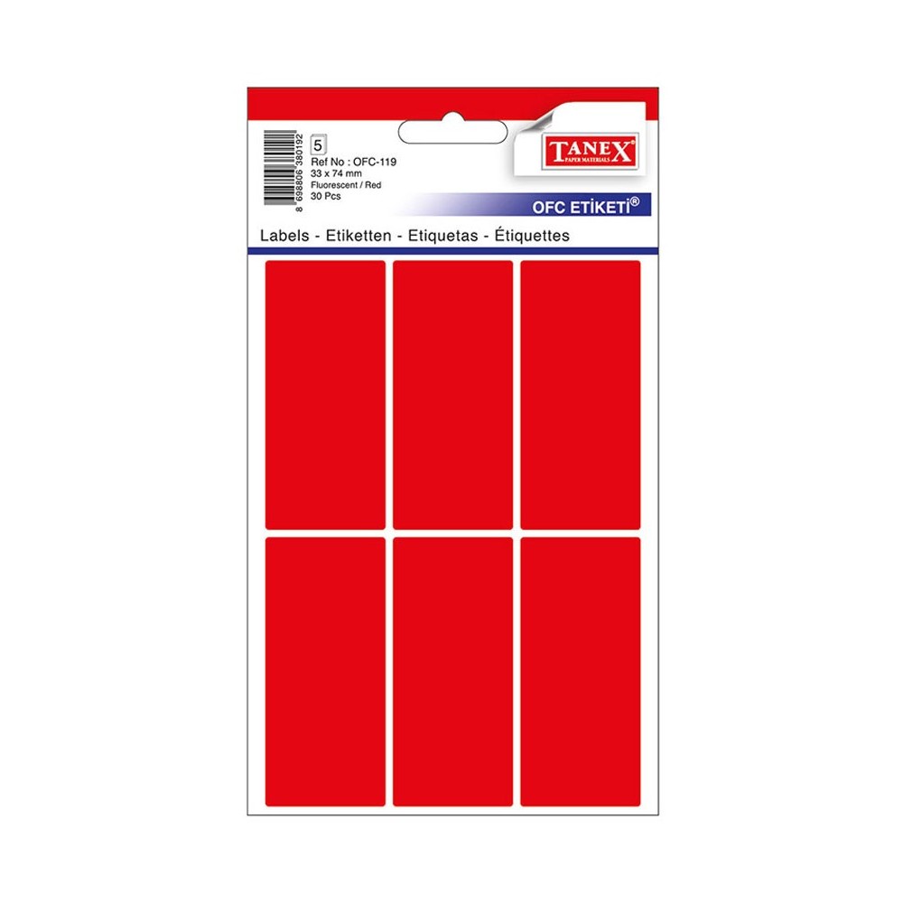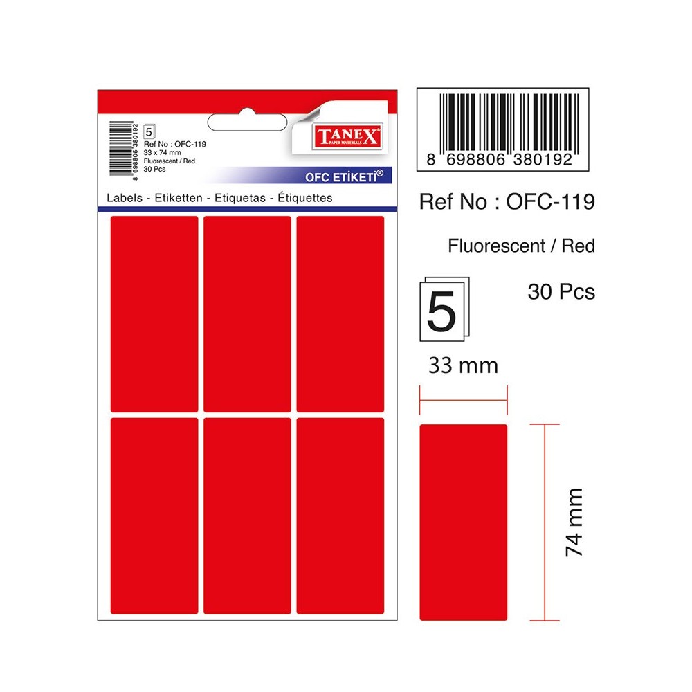 Dimensiuni eticheta: 33 x 74 mm. Forma dreptungiulara, colturi rotunjite. Culoare: rosu. Ambalare: 30 etichete/set (5 folii x 6 etichete/folie).