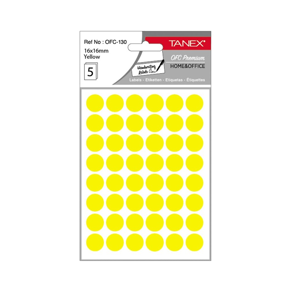 Diametru eticheta: 16 mm. Culoare: galben. Ambalare: 240 etichete/set (5 folii x 48 etichete/folie).