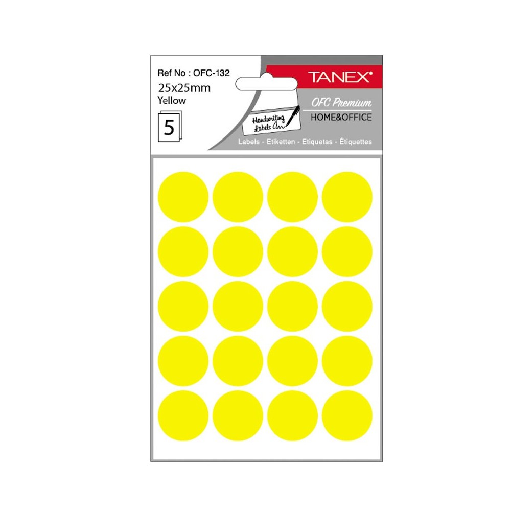 Diametru eticheta: 25 mm. Culoare: galben. Ambalare: 100 etichete/set (5 folii x 20 etichete/folie).