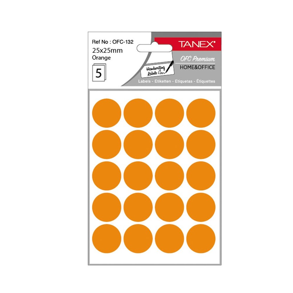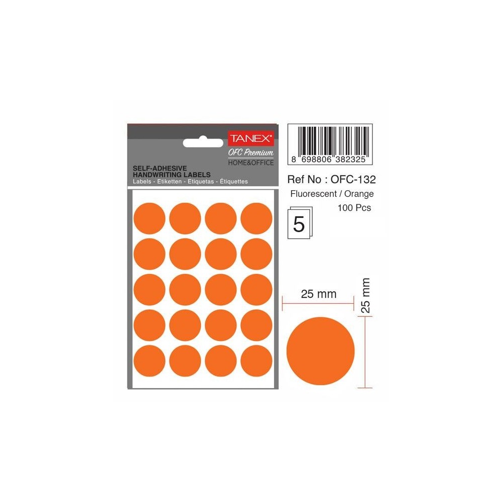 Diametru eticheta: 25 mm. Culoare: portocaliu. Ambalare: 100 etichete/set (5 folii x 20 etichete/folie).
