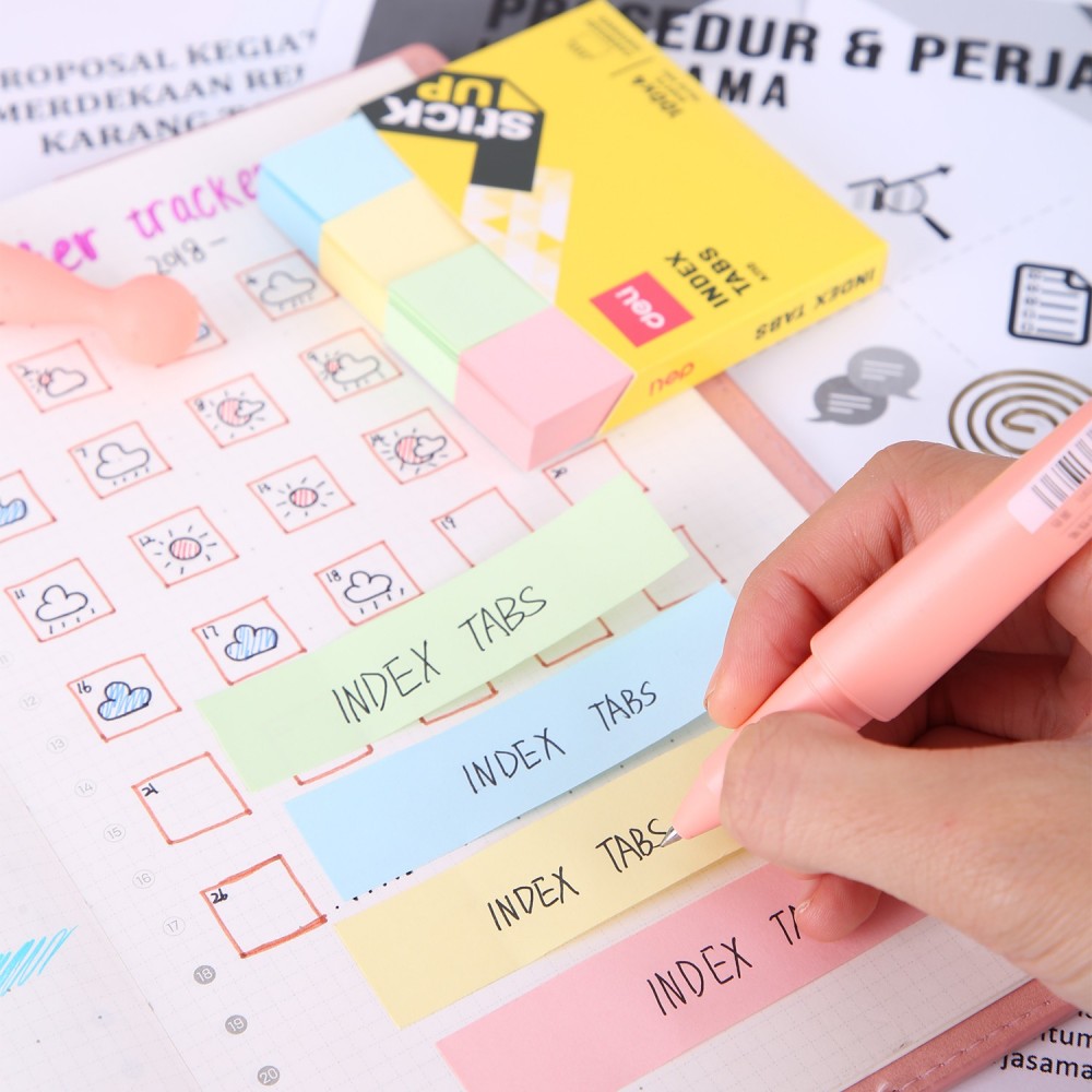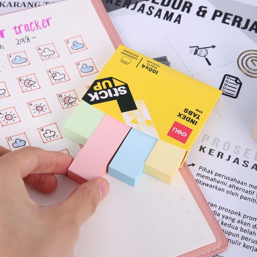 Dimensiuni: 45 x 12 mm + 45 x 25 mm. Ambalare: 4 x 100 file. Culori: 4 culori: galben, verde, magenta, albastru.