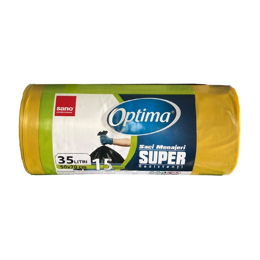Caracteristici saci menajeri SANO Optima, 35 L, 15 buc/rola: - Saci menajeri cu o rezistenta ridicata; - Material: folie de polietilena; - Pentru colectare selectiva pe culori; - Potrivit pentru: deseuri menajere; - Sunt pretaiati si se desprind usor; - Volum: 35 L; - Dimensiuni: 50x70 cm; - Ambalare: 15 buc/rola; - Culori disponibile: negru, albastru, rosu, verde, galben.